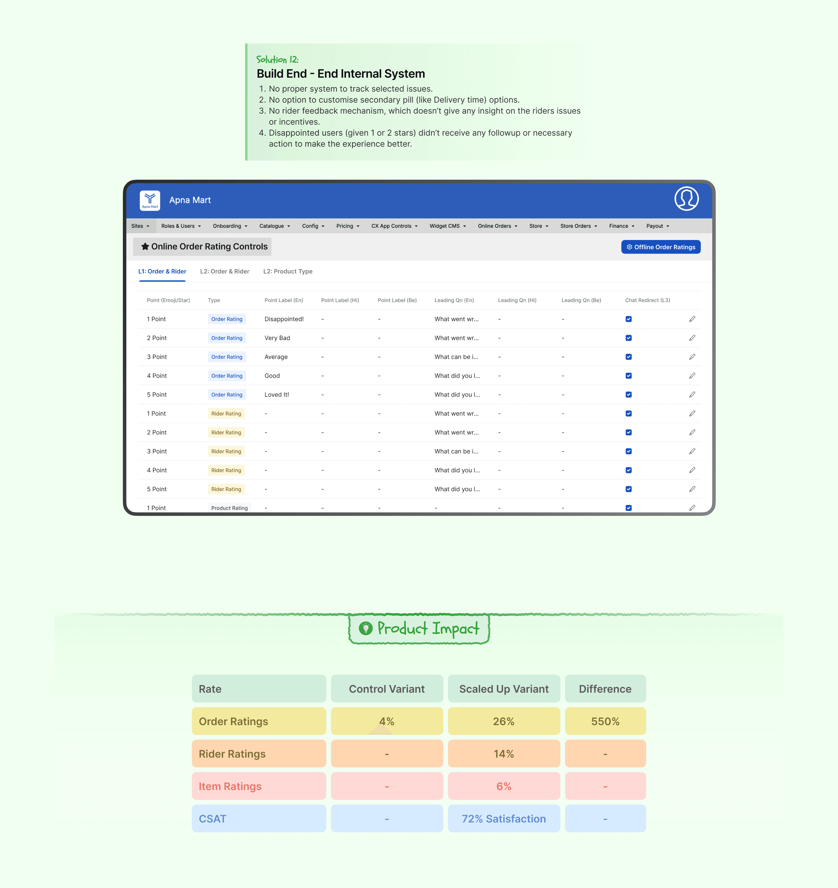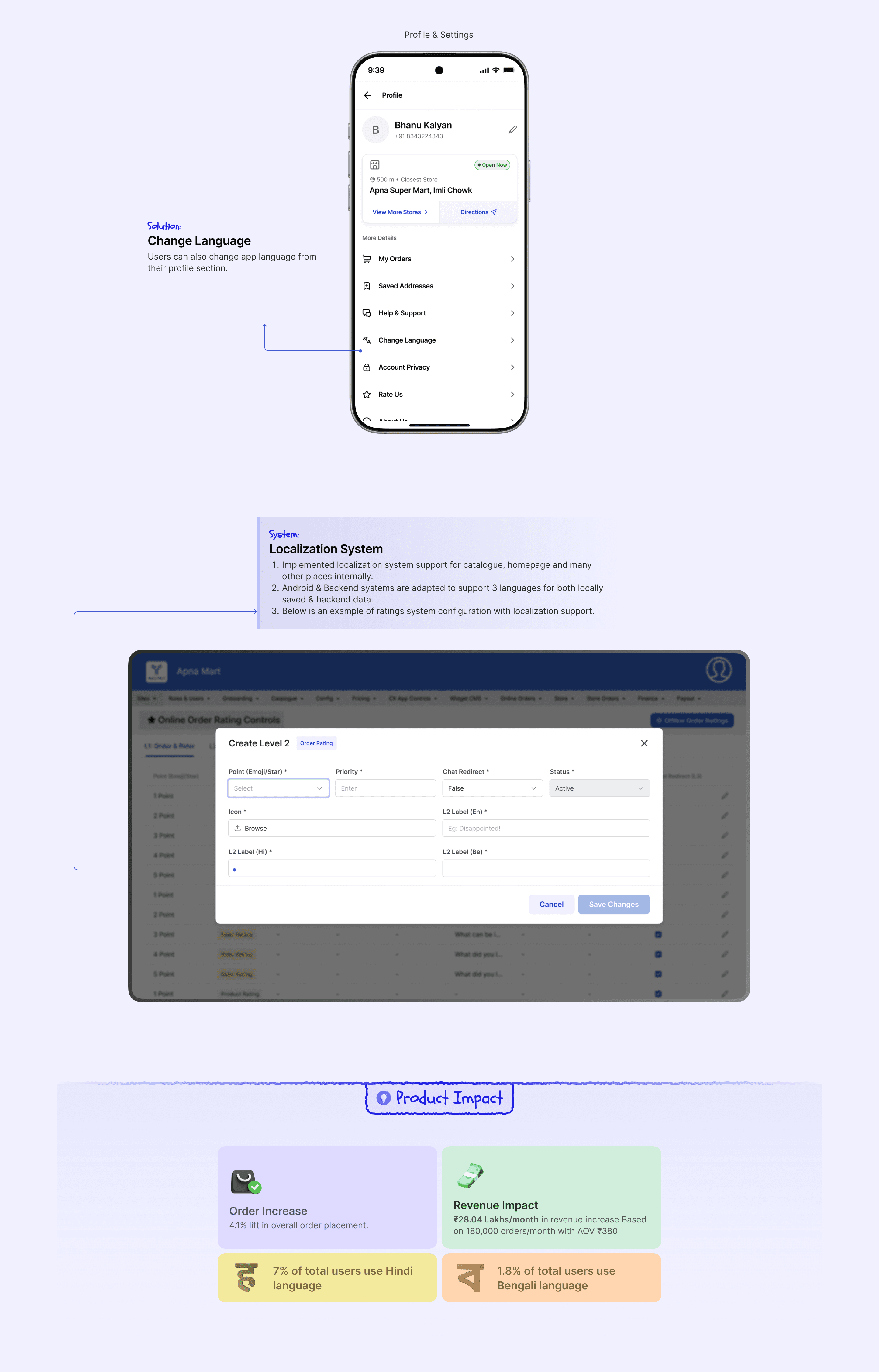₹54.72 Lakhs/month in direct revenue impact through strategic UX improvements that reduced order cancellations by 56.52% and increased order placement by 4.1%, while boosting user feedback collection by 550%.
