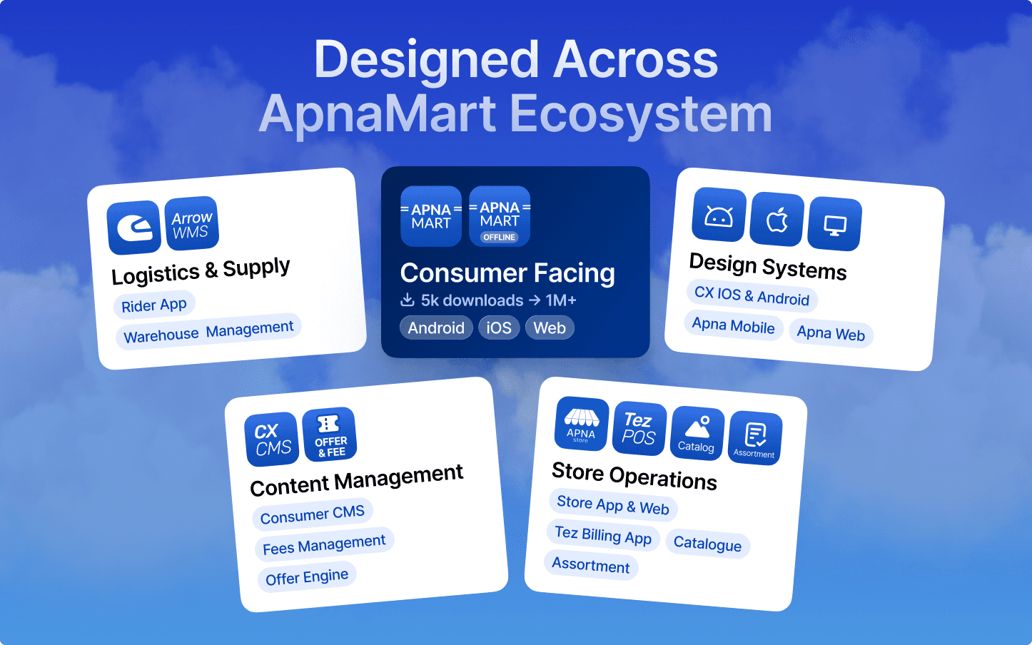 Over 2.5 years at Apna Mart, I designed across an interconnected digital retail ecosystem spanning multiple user types and complex workflows across Web, Android and iOS platforms.