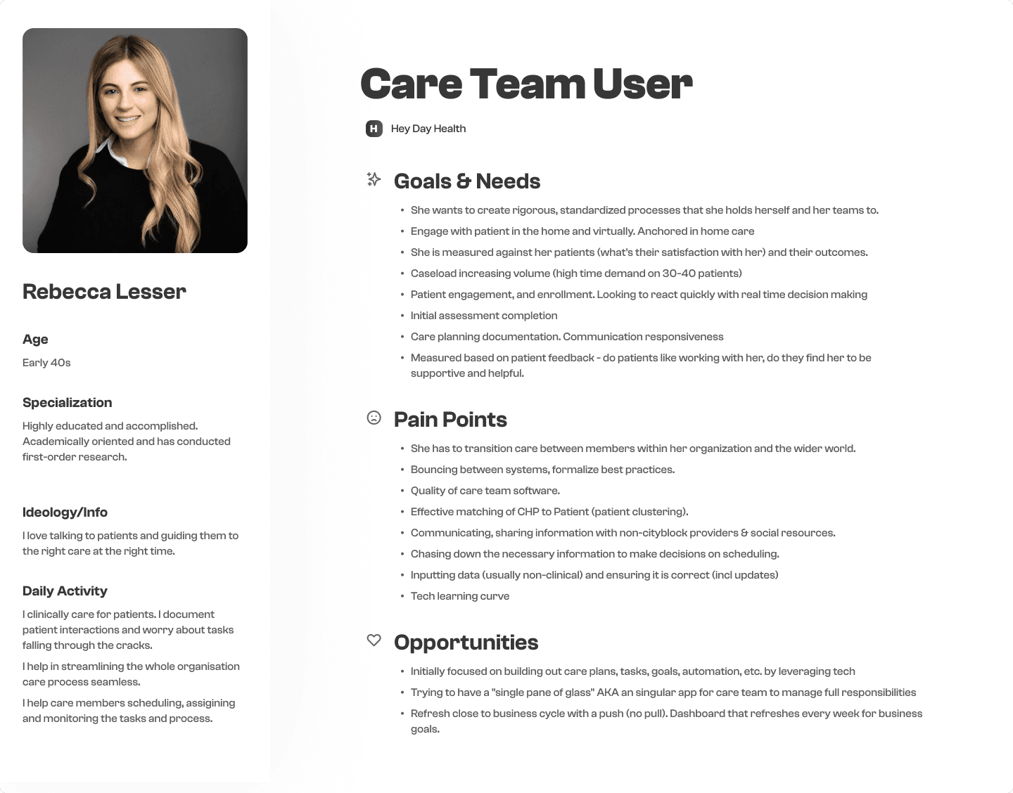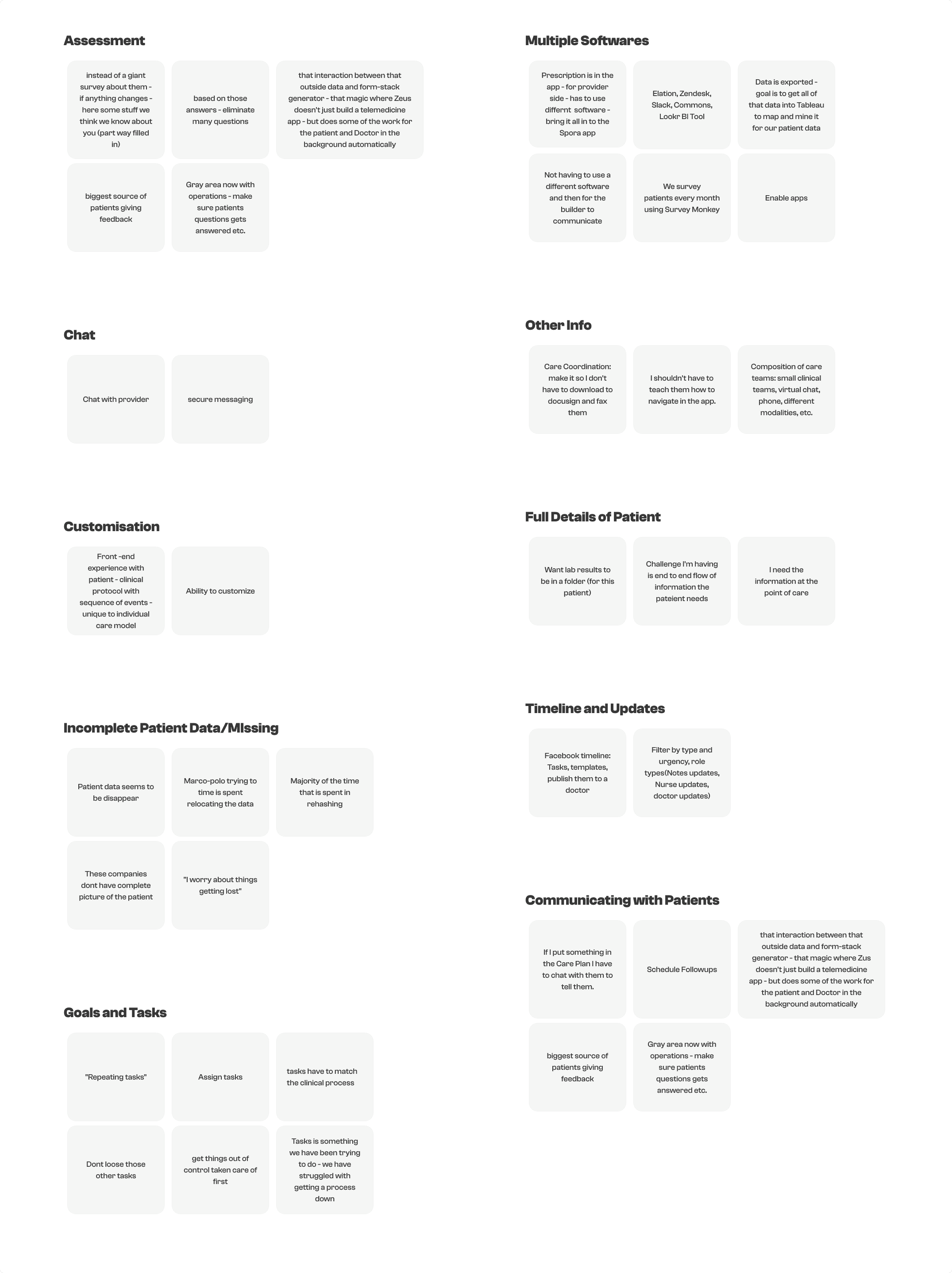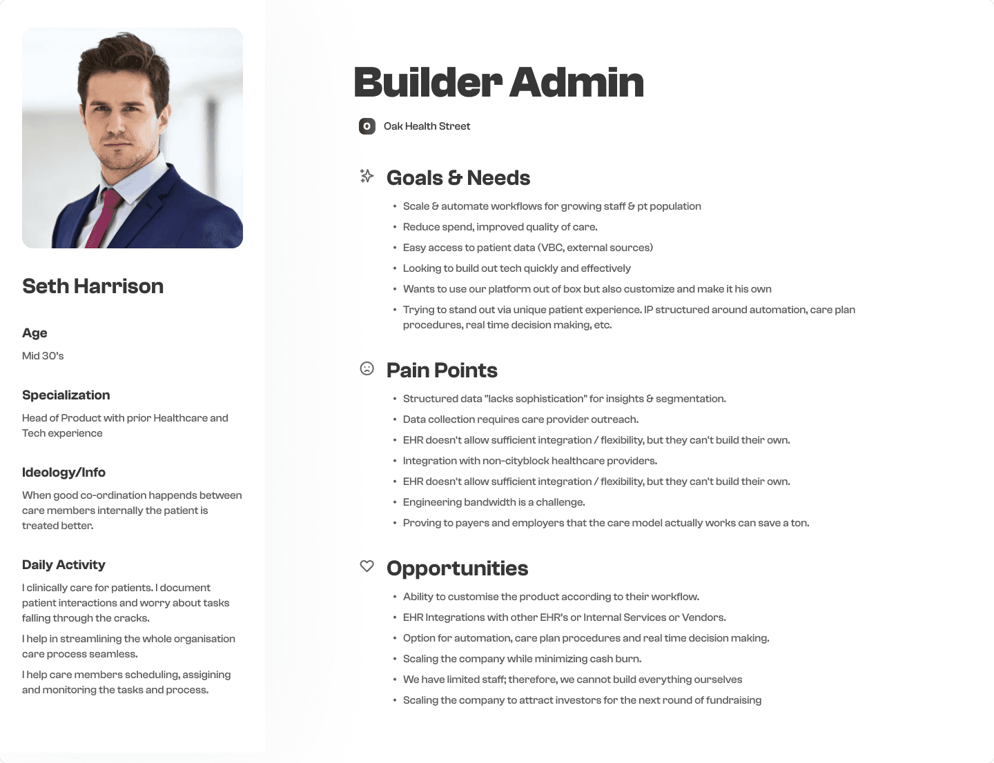 We have conducted interviews with CEO Jonathan Bush, Evan Wittry Head of Engineering at Firefly, and a few others. To get deeper understanding about healthcare, its workflows, and its problems.